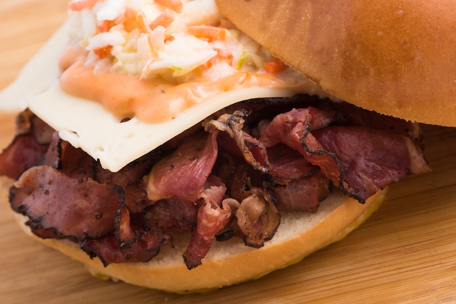1/4 lb (4 oz) Pastrami cured & hand rubbed with a custom splice blend. Naturally hardwood smoked. Tender & delicious! Customize it your way!